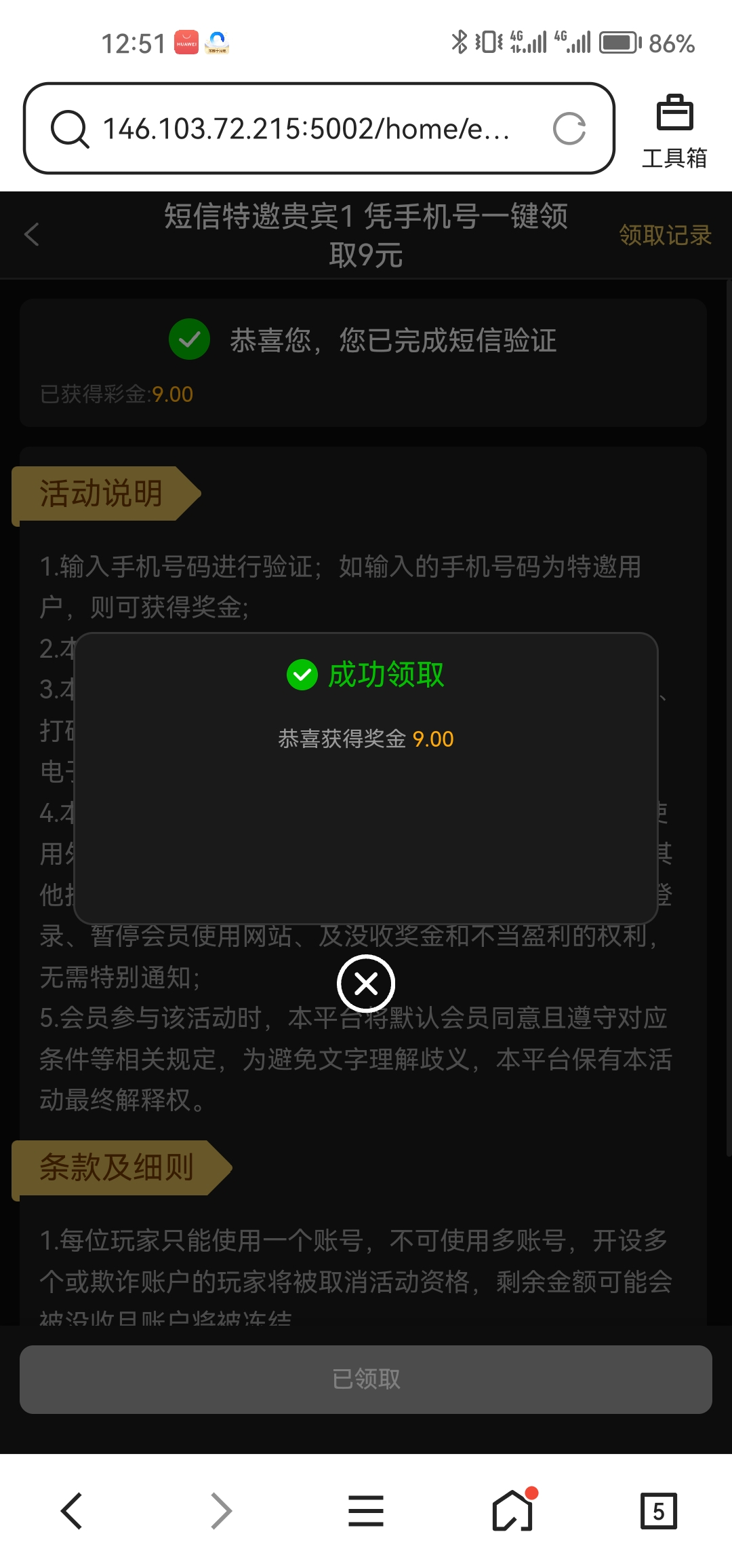 短信自助9彩金,没打出来