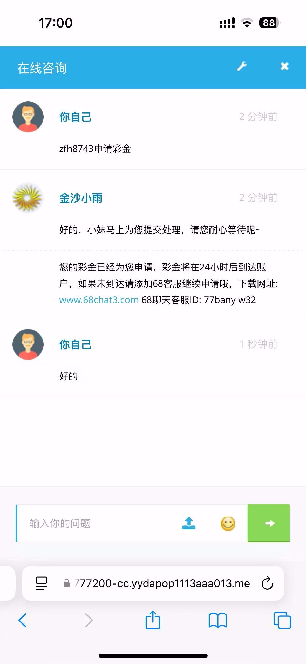 注册后联系客服领取,或者联系68客服申请,我等了5个小时到账的,点击打开注册链接:777201.cc