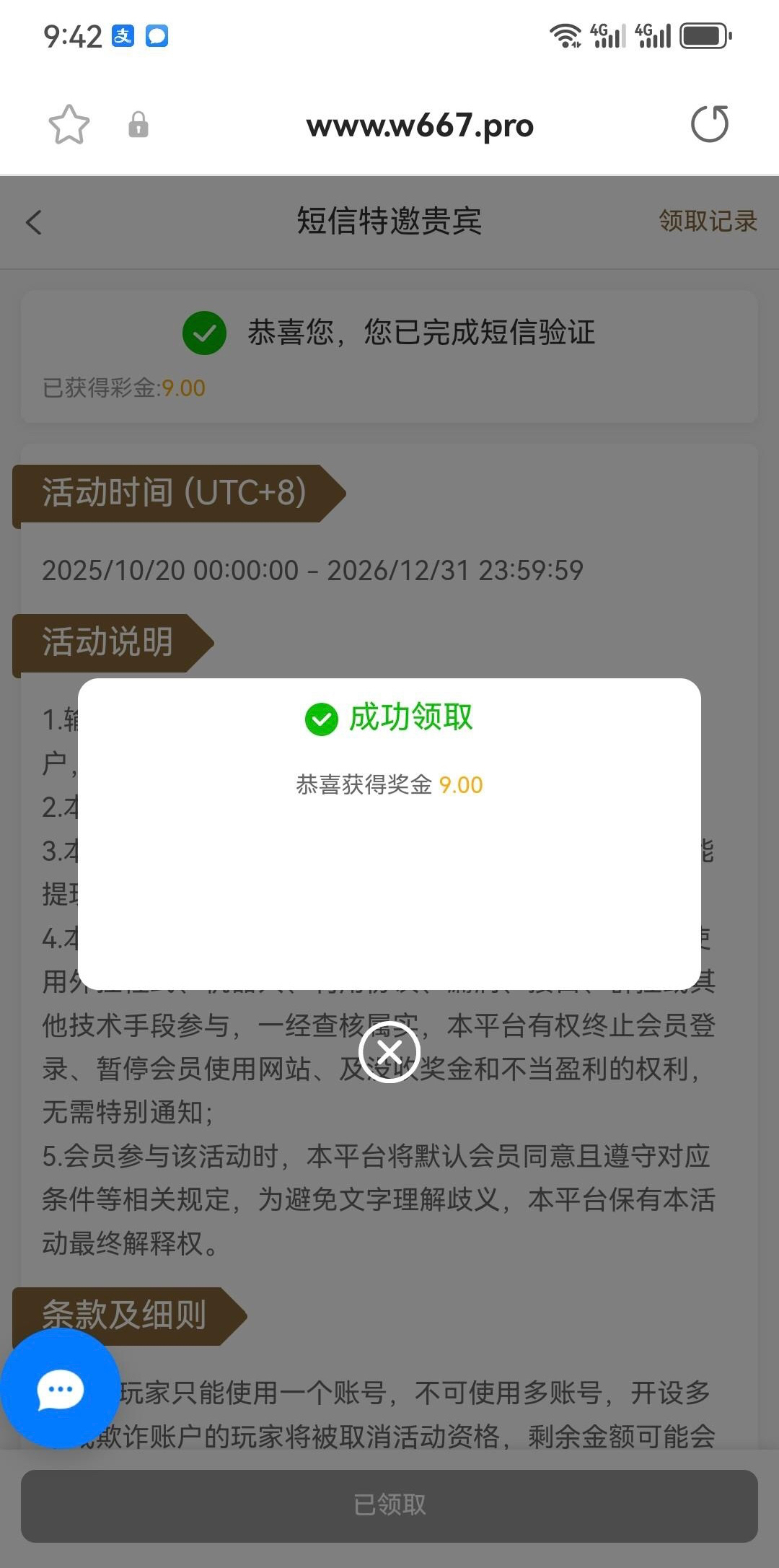现在送9验证就能领。注册直接去活动输入手机号能发码再去绑定手机号!网址w667.pro