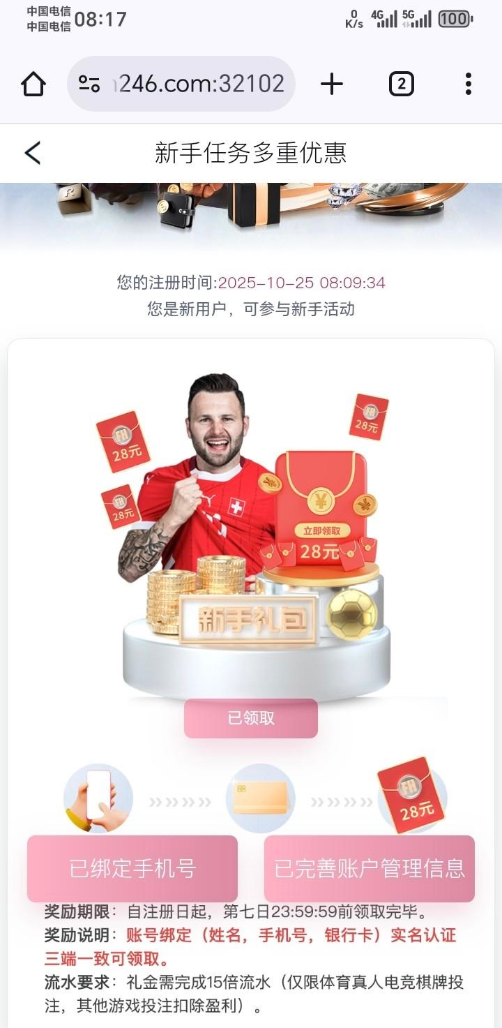 注册自己实名绑卡优惠里面领取新人28,权限体育真人电竞棋牌网址:https://www.9fh246.com